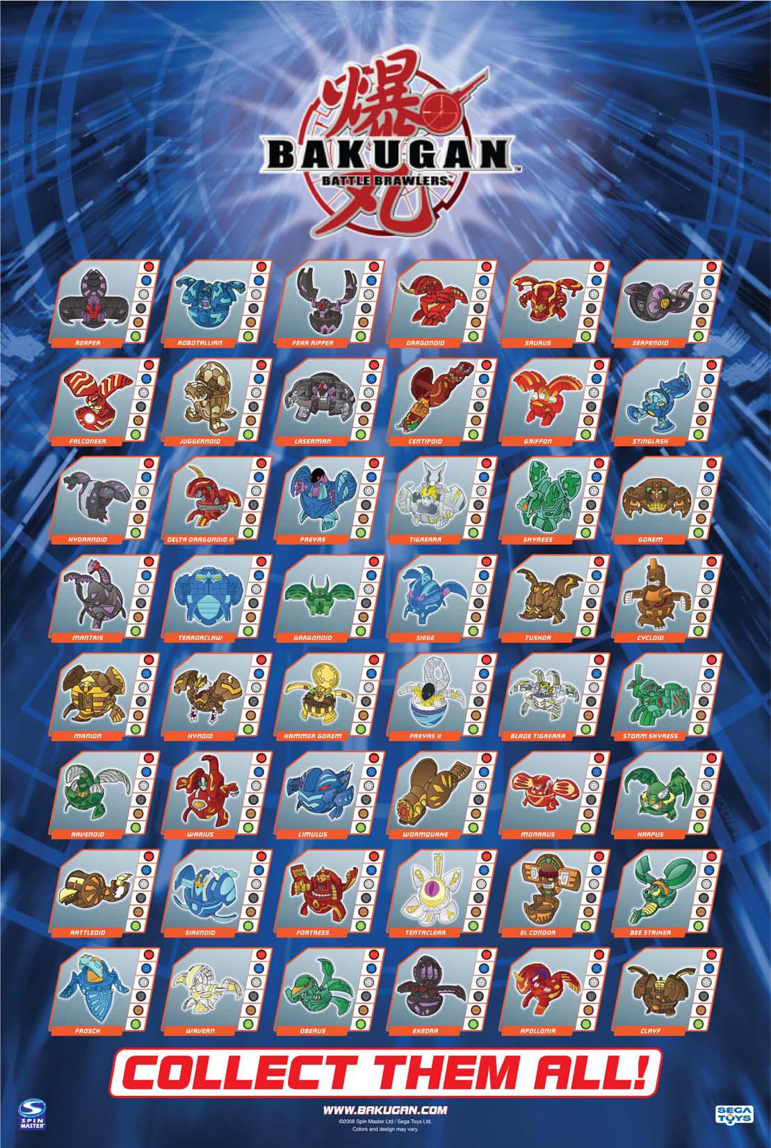 A poster for Bakugan Battle Brawlers which contains the 48 Bakugan that were released.
