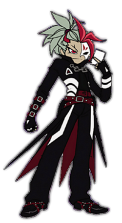Marduk wears a white mask that covers the left side of his face. He is dressed completely in black, has pointed eyebrows, red eyes, and silver hair with red streaks. He also wears a long black coat with a frayed tail.